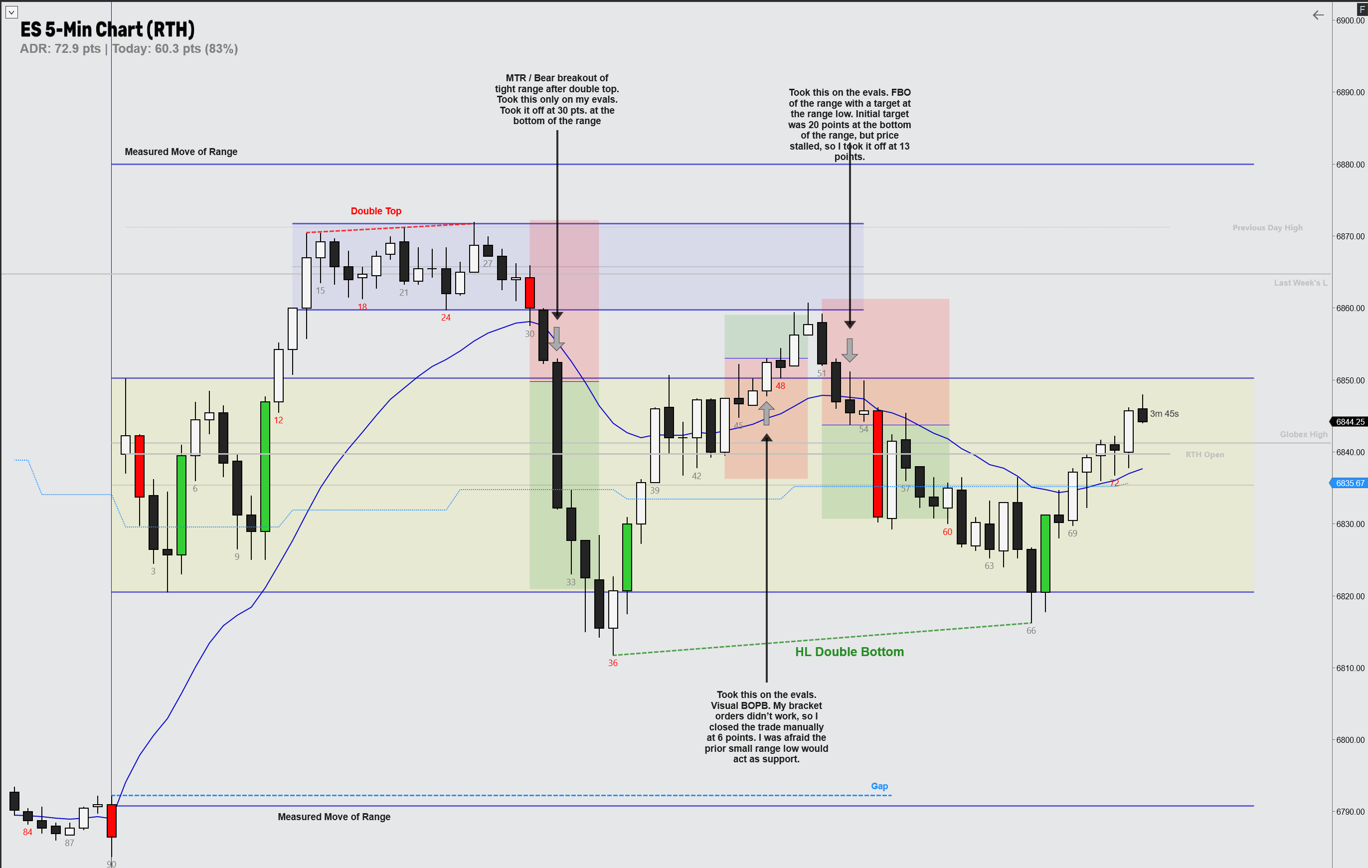 Eventually, we got an MTR / bear breakout out of that tight range, after a clear double top and a bull wedge top. I took this trade only on my evals and took it off for +30 pts at the bottom of the larger, earlier range. My thinking was that we would probably also see the overnight gap get filled.