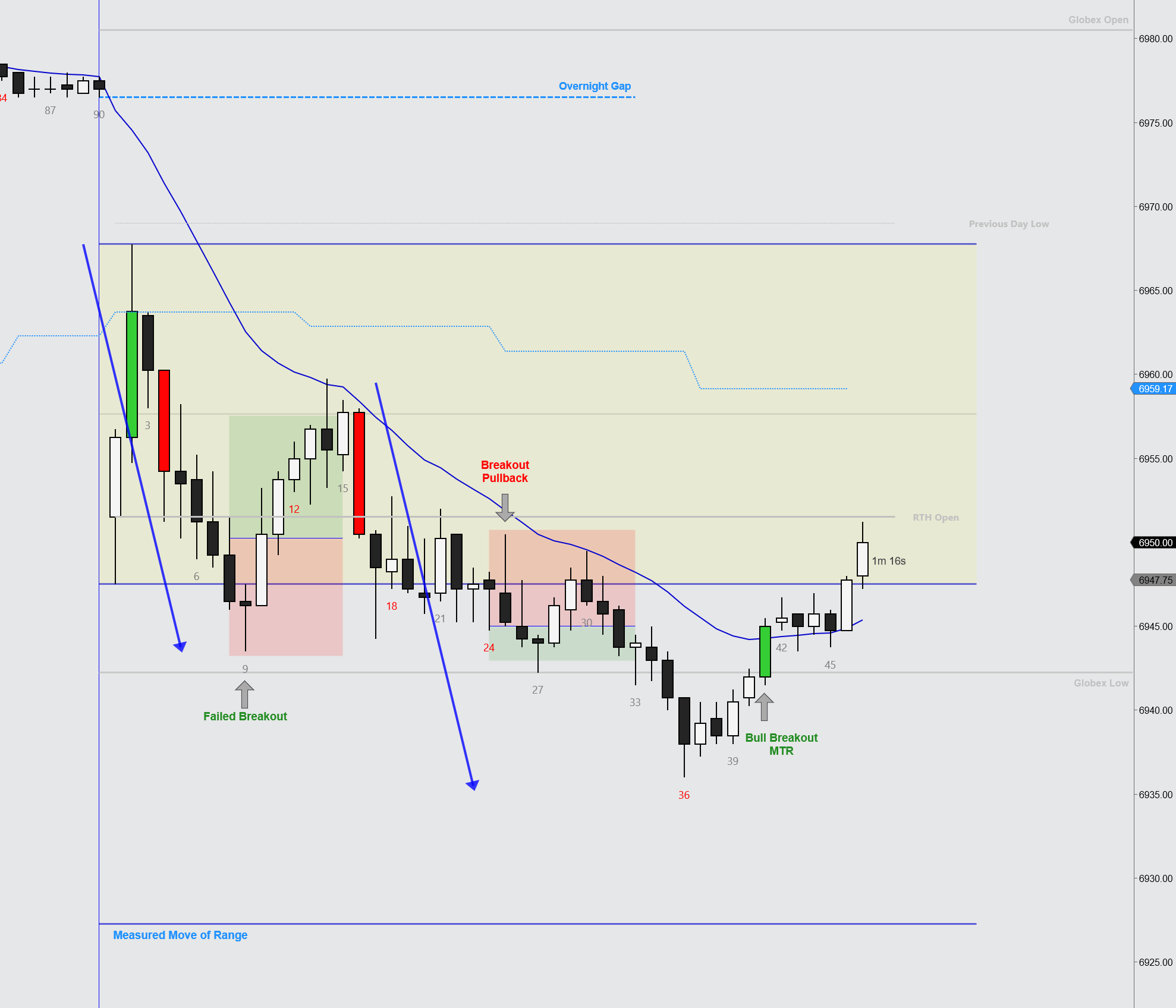 Prices struggled to get lower at first and pulled back, so I took the trade off at +2 pts. Shortly after, prices did in fact hit my original target of +9 pts at the measured move of the second leg. So the read on the context was spot on, even if I did exit too early.