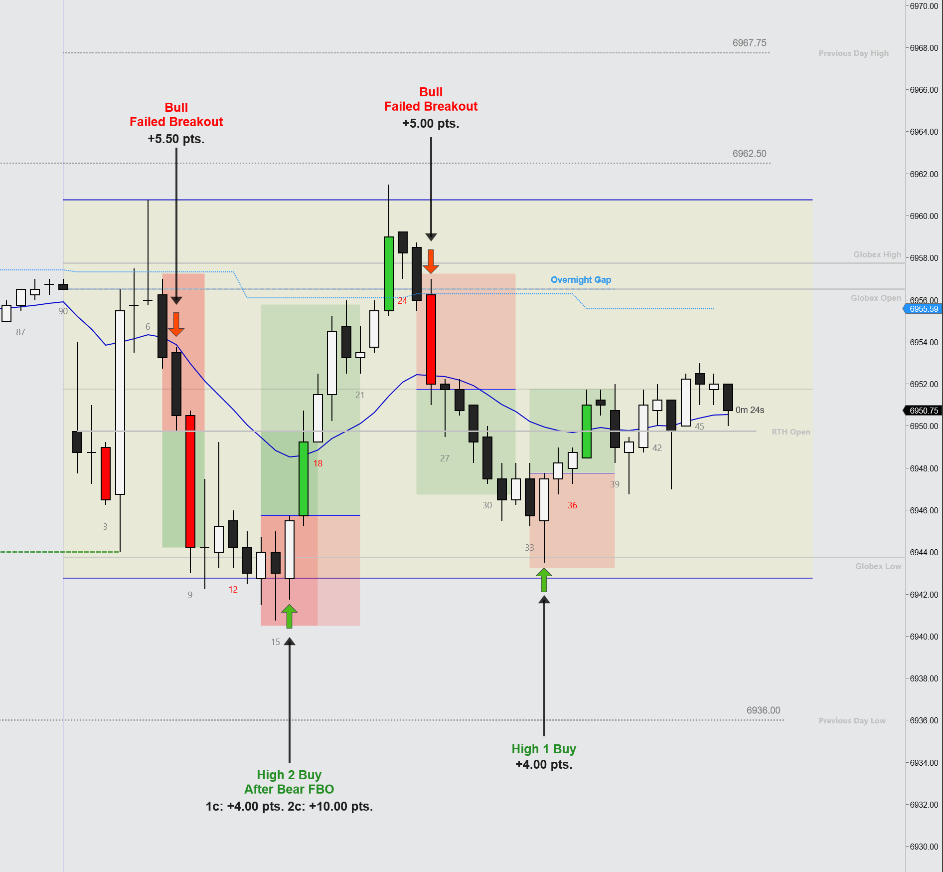 When we then got two consecutive bear bars closing near their lows, I entered short, betting on prices rotating back down toward a possible range low. It was a risky entry, but the overall structure looked range-like, and I felt comfortable with the idea that I could scale in higher if we got a pullback. The trade worked out nicely for +5.50 pts. After that move, prices stalled again around the Globex low and the range low.