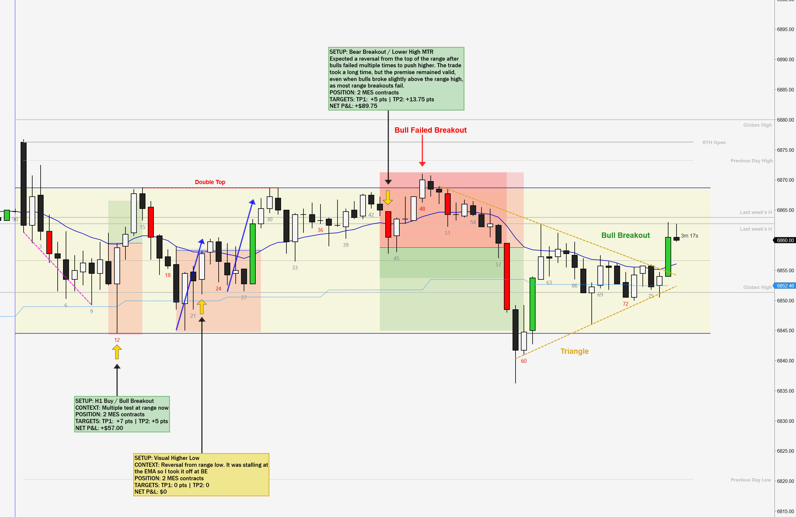 Trading inside a range is all about timing and context. The setups can look great, but when the market is flipping between strong reversals and deep pullbacks, you’re always one leg early or one leg late. Today was a good reminder that patience is everything in a range. Let the extremes form, wait for the clear trapped-trader setups, and avoid getting sucked into the middle where the market just chews you up.