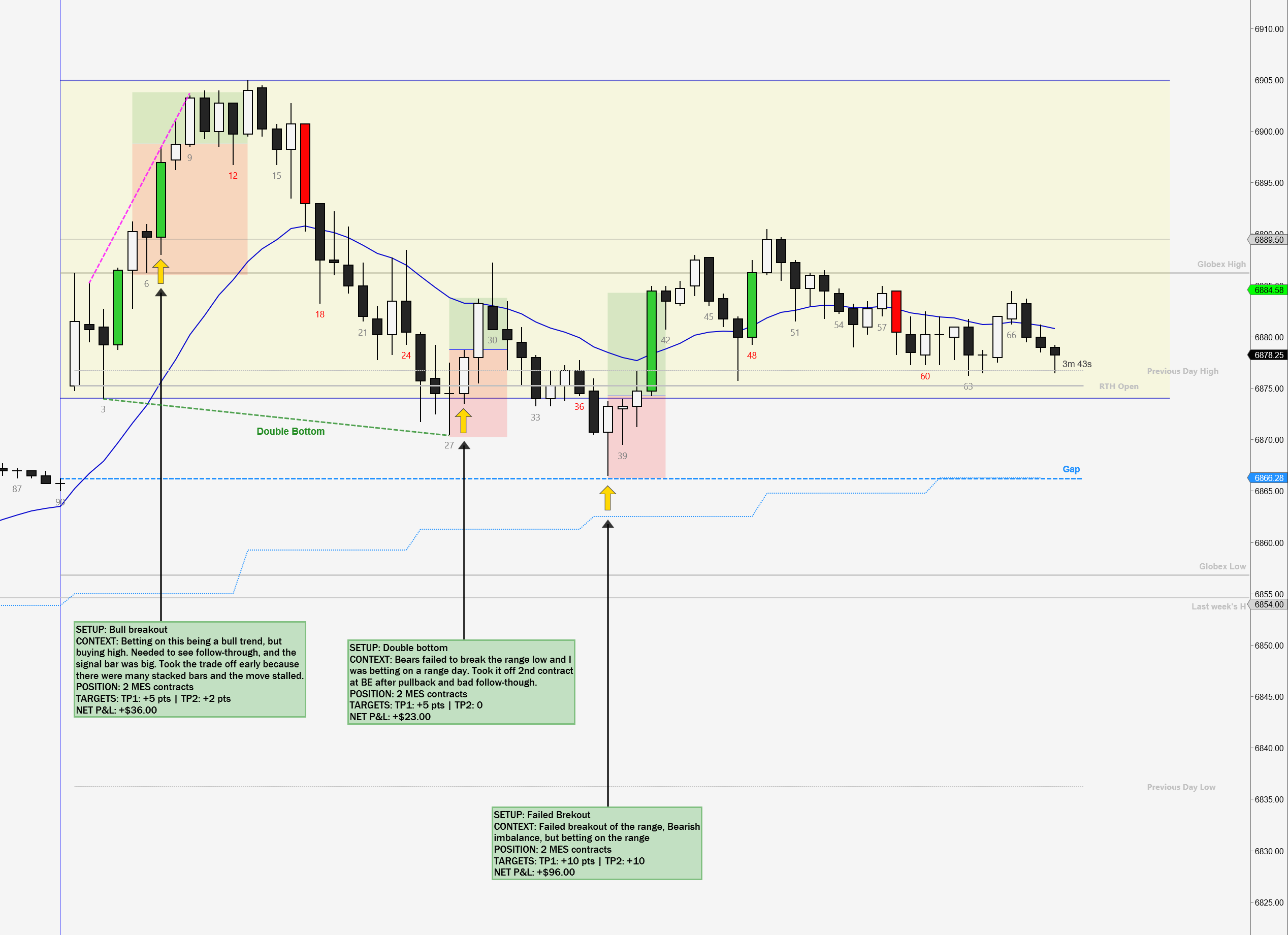 My first target at +10 pts was hit pretty quickly. I wanted to hold the second contract for the top of the range, but as soon as prices reached the middle of the range, it stalled. That area had clearly been a sell zone earlier, so I took off the second contract at +10 pts as well. A decent pullback happened right after, so exiting there was the right decision.