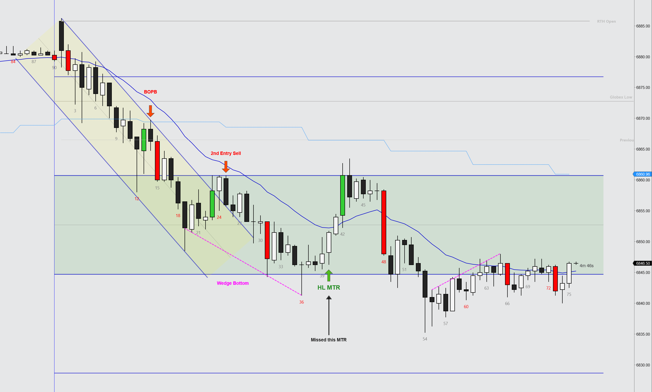 We then hit the measured move of the first leg down, and a second entry sell formed. At the same time, we were also getting a potential wedge bottom, and there were a lot of overlapping bars. That added to my hesitation. I was still worried the bear trend was running out of momentum, and I was actually looking for a possible MTR instead. The bear trend just didn’t seem strong enough anymore, so I stayed cautious and didn’t want to sell all the way down. In hindsight, that hesitation was probably a mistake — but that’s trading.