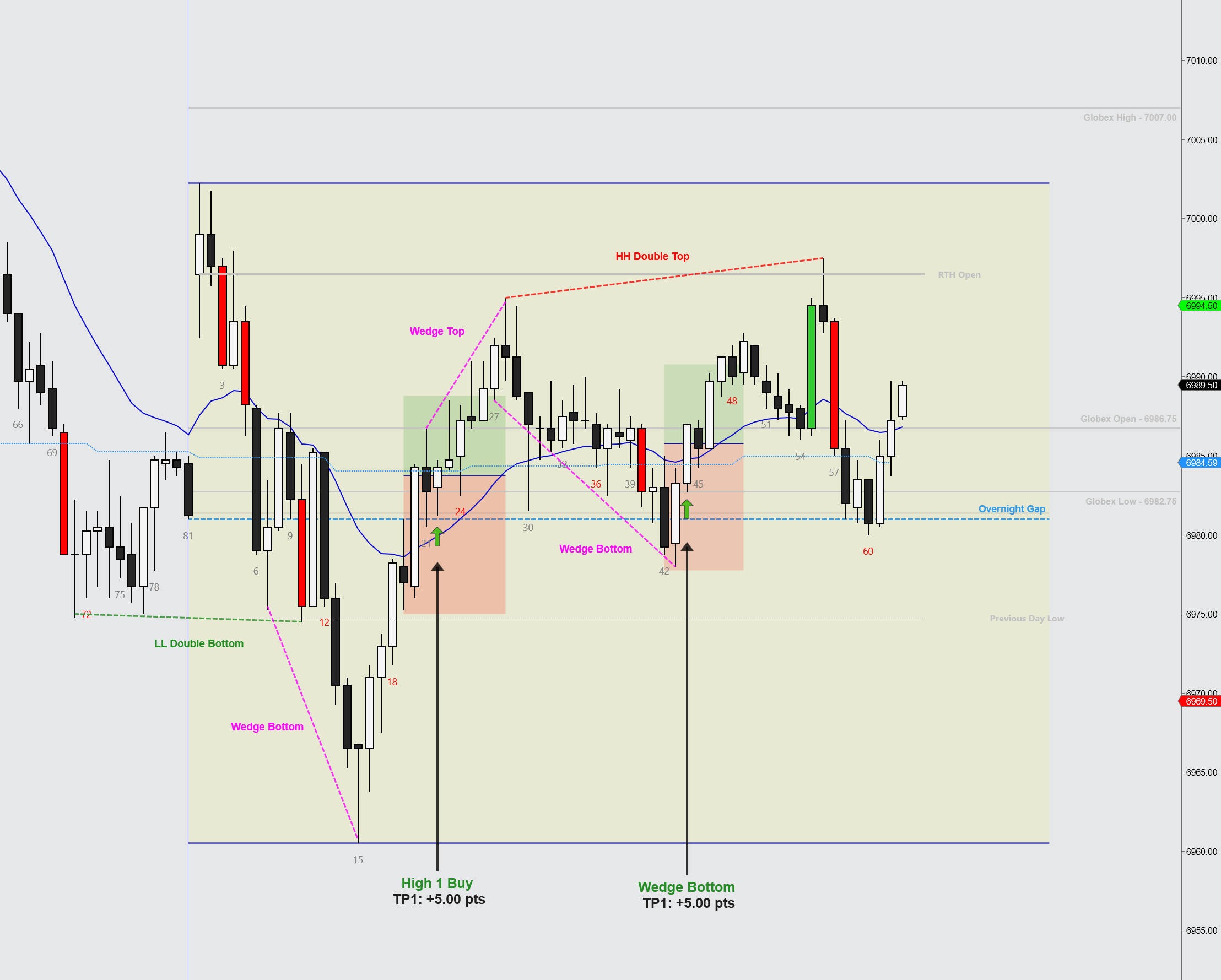 When I got back from dinner there was a bull wedge bottom with two consecutive bull bars closing at or near their highs, and the second closed above the 20 EMA, so I entered long. I have trust issues with today’s market, so I only entered with 1 contract. When the market stalled around 5 pts., I took it off.