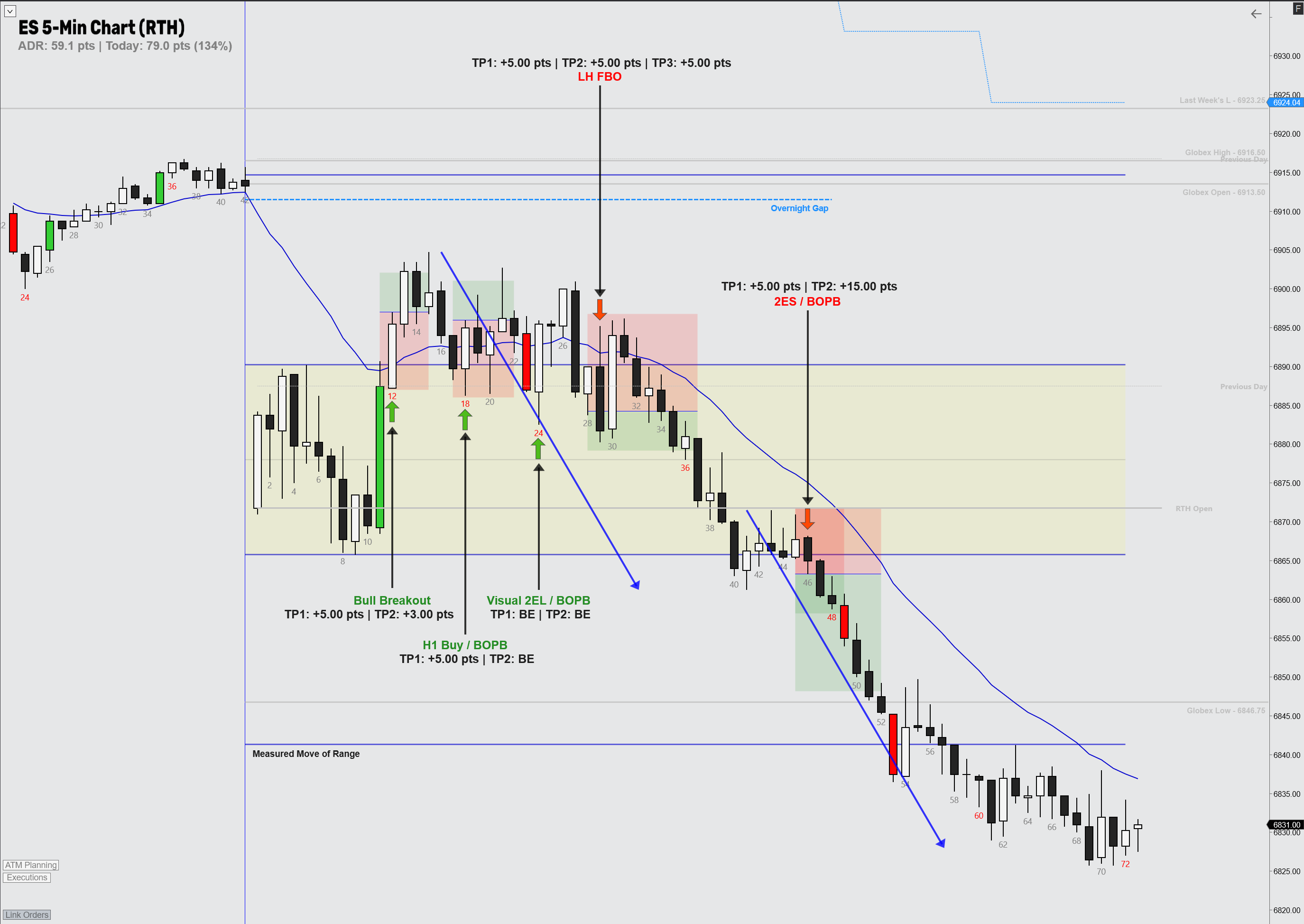 Now the bulls had tried 3 times to go higher, so when price formed a Lower High after the bull failed breakout I entered short, expecting the bears to take over and take price to the range low. Again price stalling and showing low momentum fooled me to exit. I took all contracts off at 5 pts. Right after I exit, price dropped down and would have hit all my initial targets. Frustrating, so I took a dinner break.