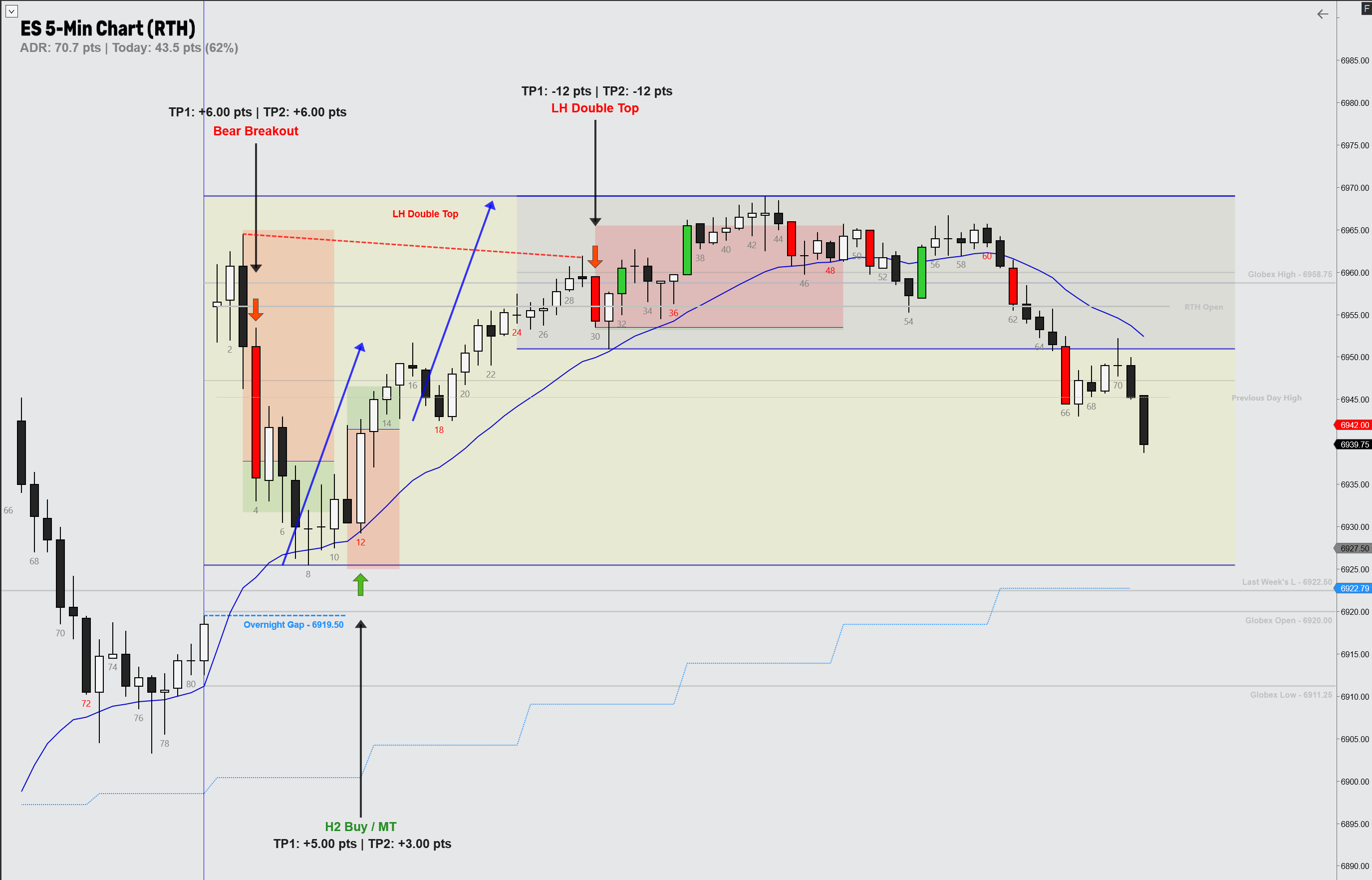 Session started with a decent size gap up. Bar 1–3 formed a triangle, and when we got bar 4, a big bear breakout bar, I took a chance on a short betting on the overnight gap being closed. I took both contracts off at +6.00 pts. since we had news coming out at 9.00 CT.