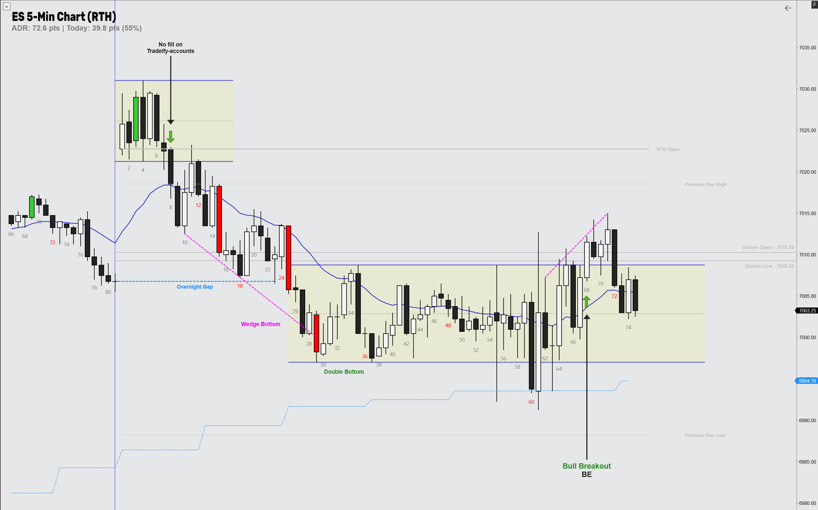 Day started with 6 bars stacked side by side. We did have an overnight gap down, so when the bears managed to print a decent breakout bar, I entered short. A bit risky since I was selling right into the EMA, so I was only trading the Tradeify evals.