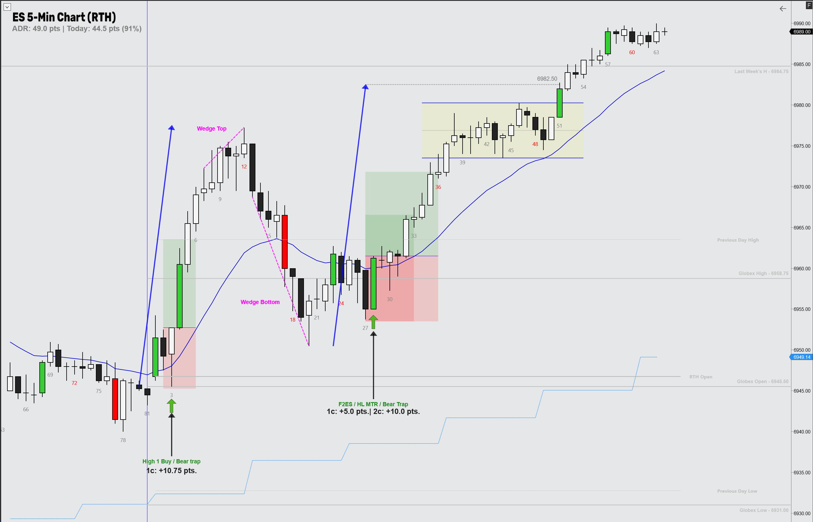 My plan was to take 5 pts on the first contract and 15 pts on the second, just below the high of day. When price stalled around +12 pts, I got nervous about a pullback and decided to take the trade off at +10 pts. As usual, a few bars later it would have made the full +15 pts.