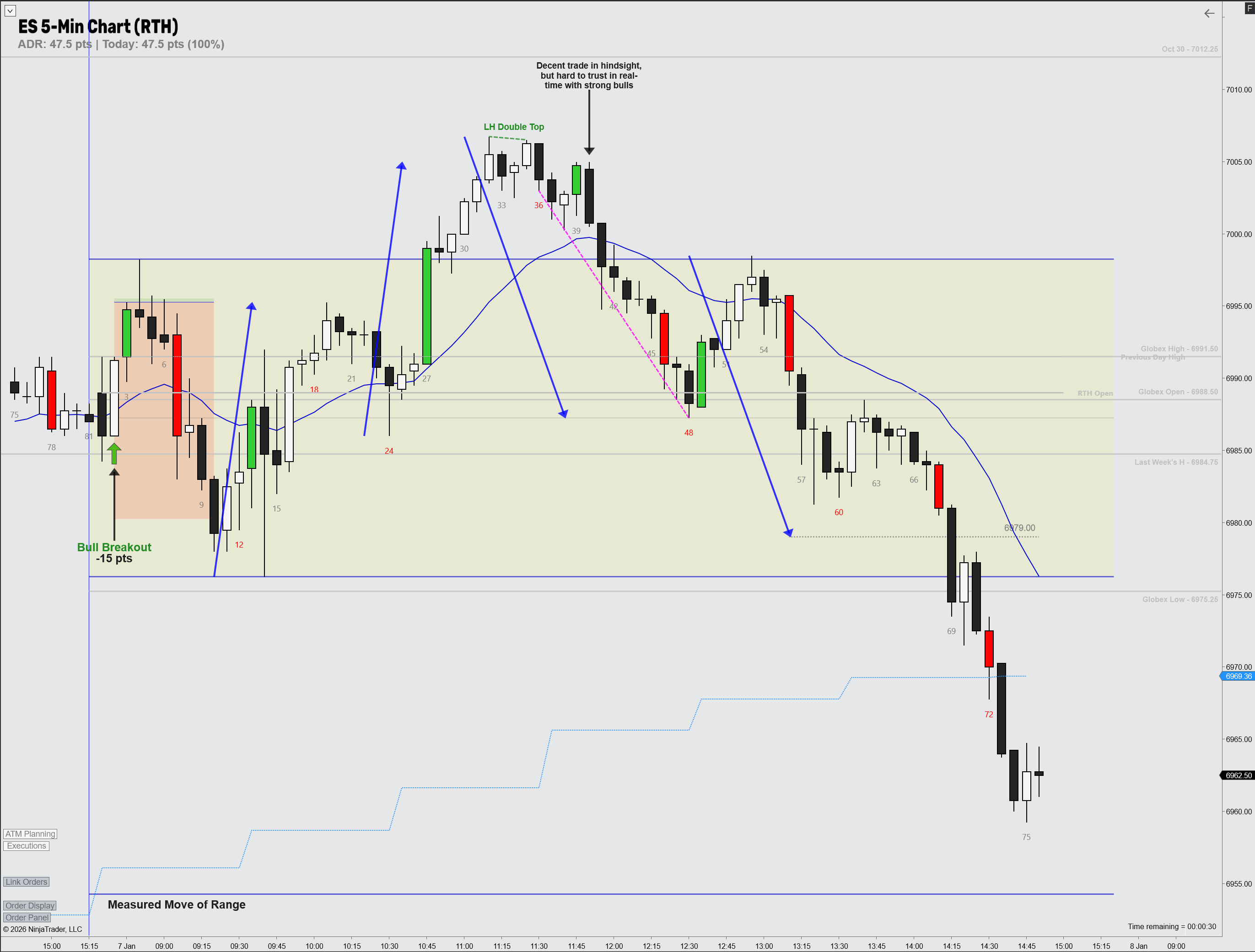 Even when the market is doing something very textbook in hindsight, trading ranges are still hard in real time. I gave the bulls too much respect inside a range environment and didn’t trust the measured move logic enough. The read was mostly correct, but I didn’t fully trust the overall structure.