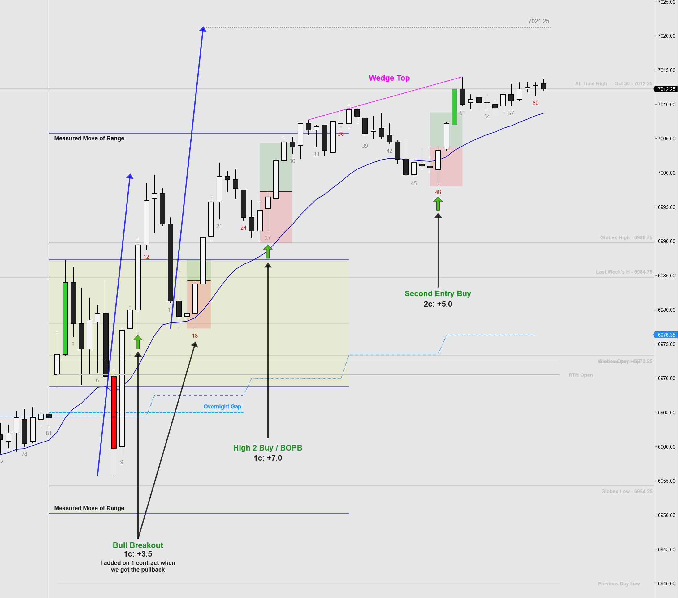 The bulls then managed to make a second strong leg up, breaking out of the range again. When we got another pullback to the range high and it formed a second entry buy / BOPB, I entered long again. My plan was to try and get a move toward the All Time High, but when price stalled at around +7 pts, I took the trade off. Holding a position this high up with the All Time High so close was honestly pretty uncomfortable, and I was expecting sellers to show up.