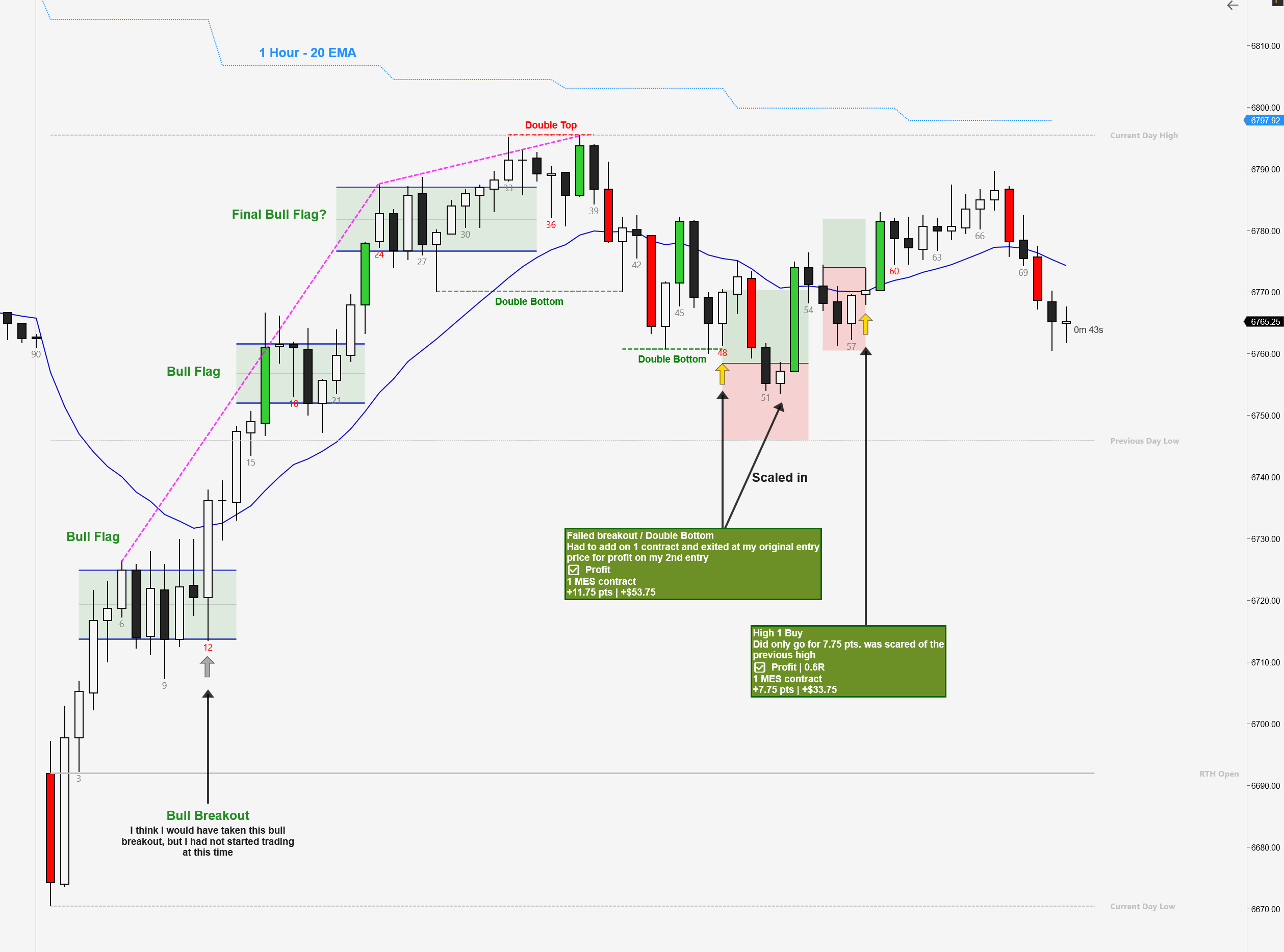 After two bearish legs down, we got a double bottom and a nice bullish bar, so I entered long expecting a test of the highs. I was buying right into the EMA, so I was prepared to add more contracts lower if needed. After I entered, prices pulled back and I did have to add one more contract. Prices stalled again at the EMA, so I exited both contracts at my original entry price — first contract at breakeven and the second with a profit of 11.75 points.