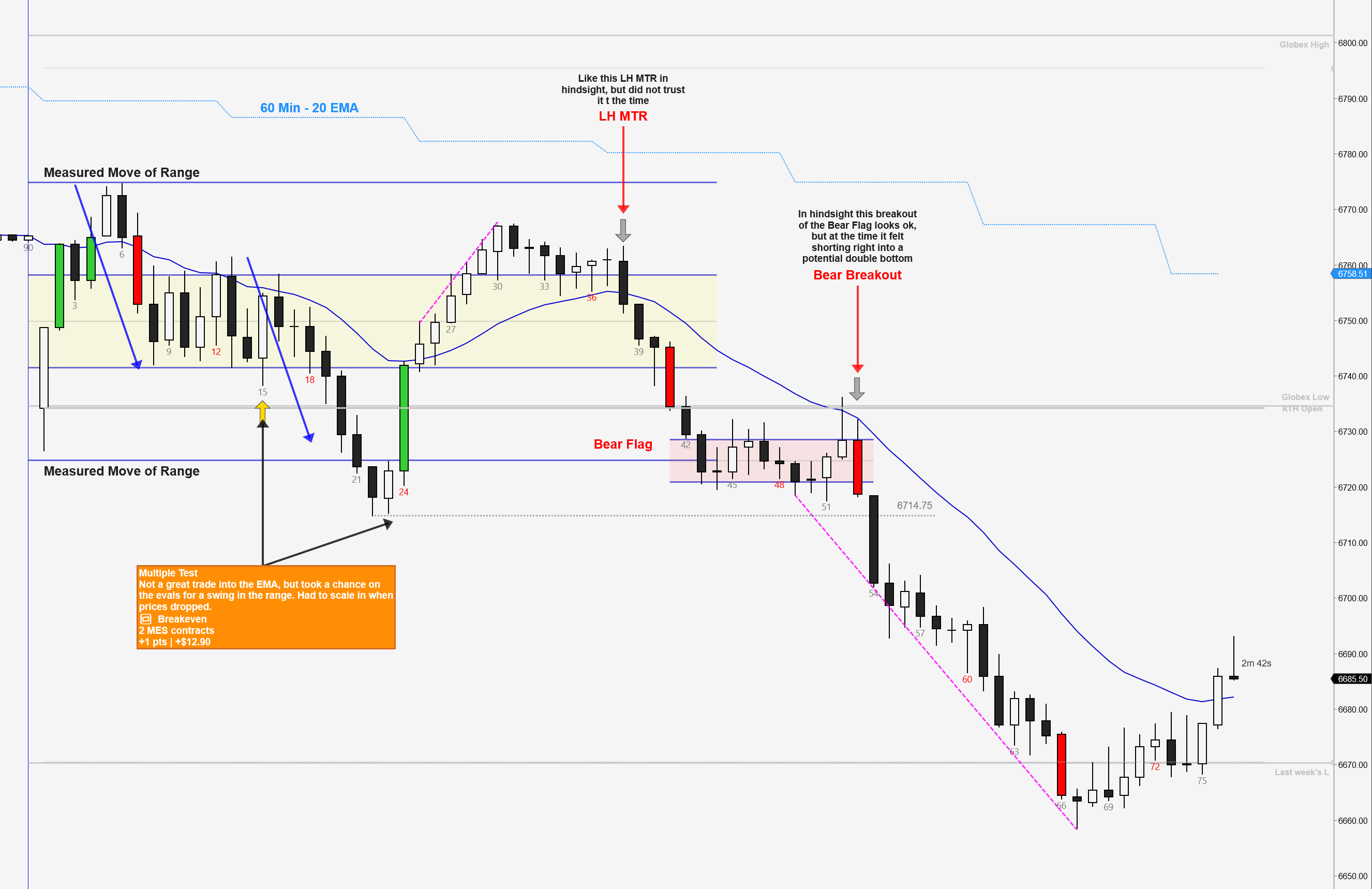 After I exited, prices continued up to the top of the range. At the top, the market formed a LH MTR, but I didn’t take it since I wasn’t sure — it would have worked nicely. Prices then tested the previous low, and the market formed a small bearish flag. I didn’t trust that setup either, since I was leaning toward a range day and was thinking it could easily form a double bottom. But prices broke out of the flag and made another strong bearish leg down.