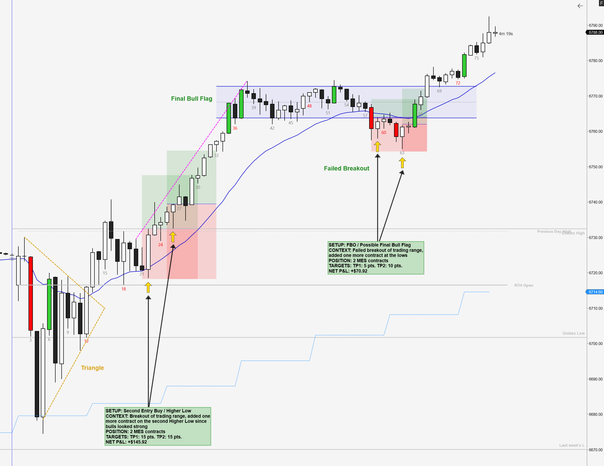 Both contracts hit their 15-point targets. I was trying to trail the last contract, but I got scared when the bars got smaller, so I exited. If I had trailed below the previous bar, I would have gotten around 30 points on that last contract. Holding trades for bigger targets without letting emotions take over is still hard, but I feel less stressed each time — so there are signs of improvement.