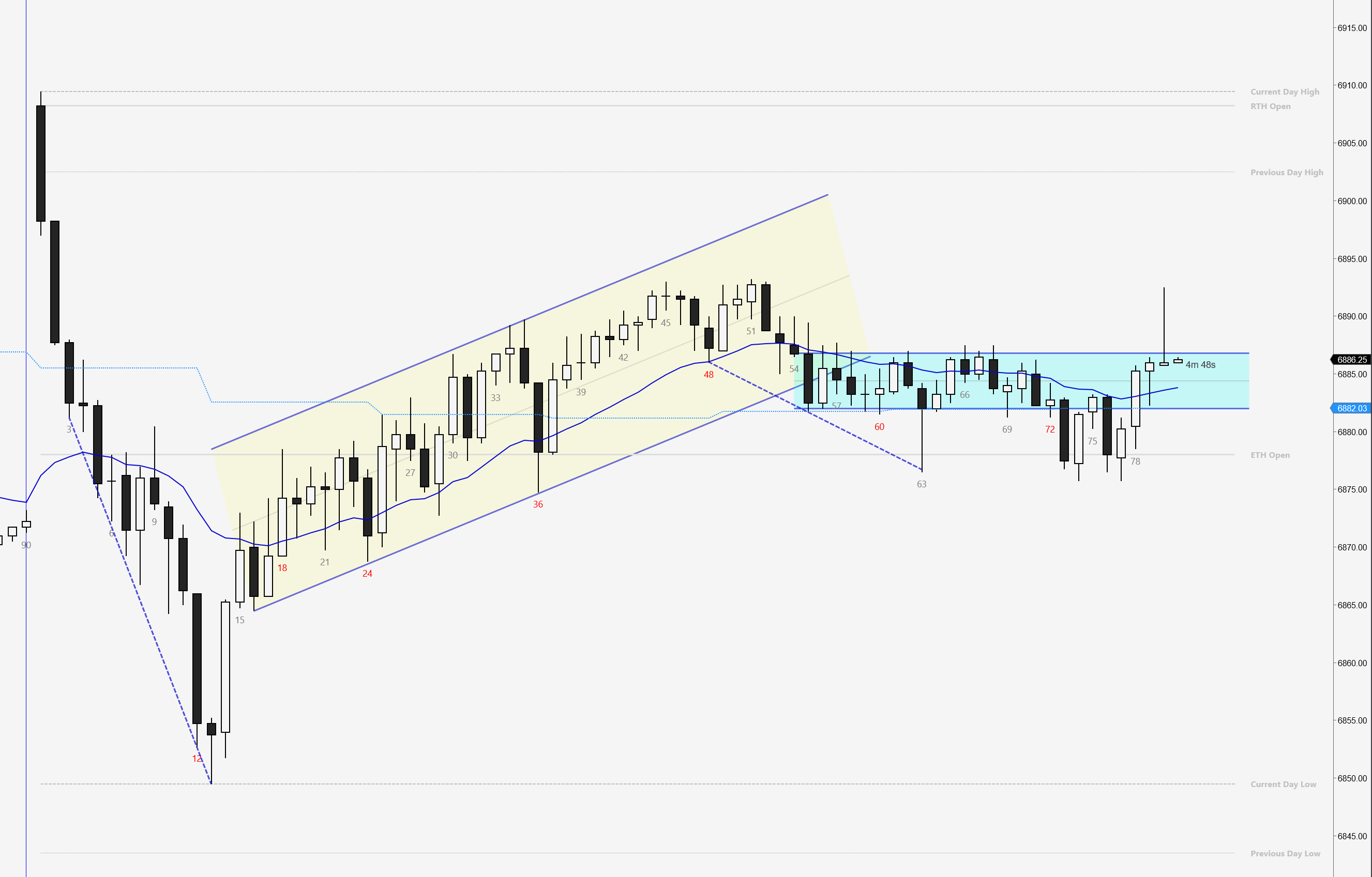 Today was an interesting day. There were two challenges — one in the NinjaTrader Arena Challenge and one in the Tradeify Challenge — and my plan was to trade both. When I got to the chart, the market had already made a couple of bearish legs down. A bullish reversal formed, creating a spike back up to the EMA. At that point, I was planning to enter long on both challenge accounts, and when we finally got a close above the EMA, I bought.