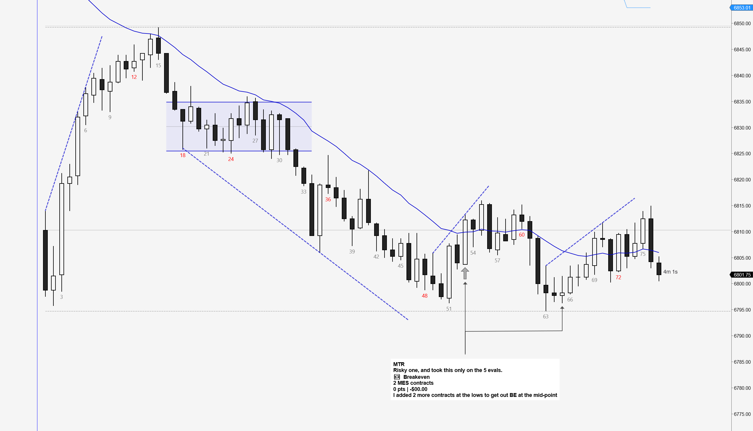 This type of scaling in is more of an advanced Brooks-style technique, and I would never do this on my PA accounts as of now. I only tried it because I was trading the five evaluation accounts with micros. I ended up exiting the trade at pretty much breakeven — the premise for the trade was over for me, as I had entered expecting a reversal.