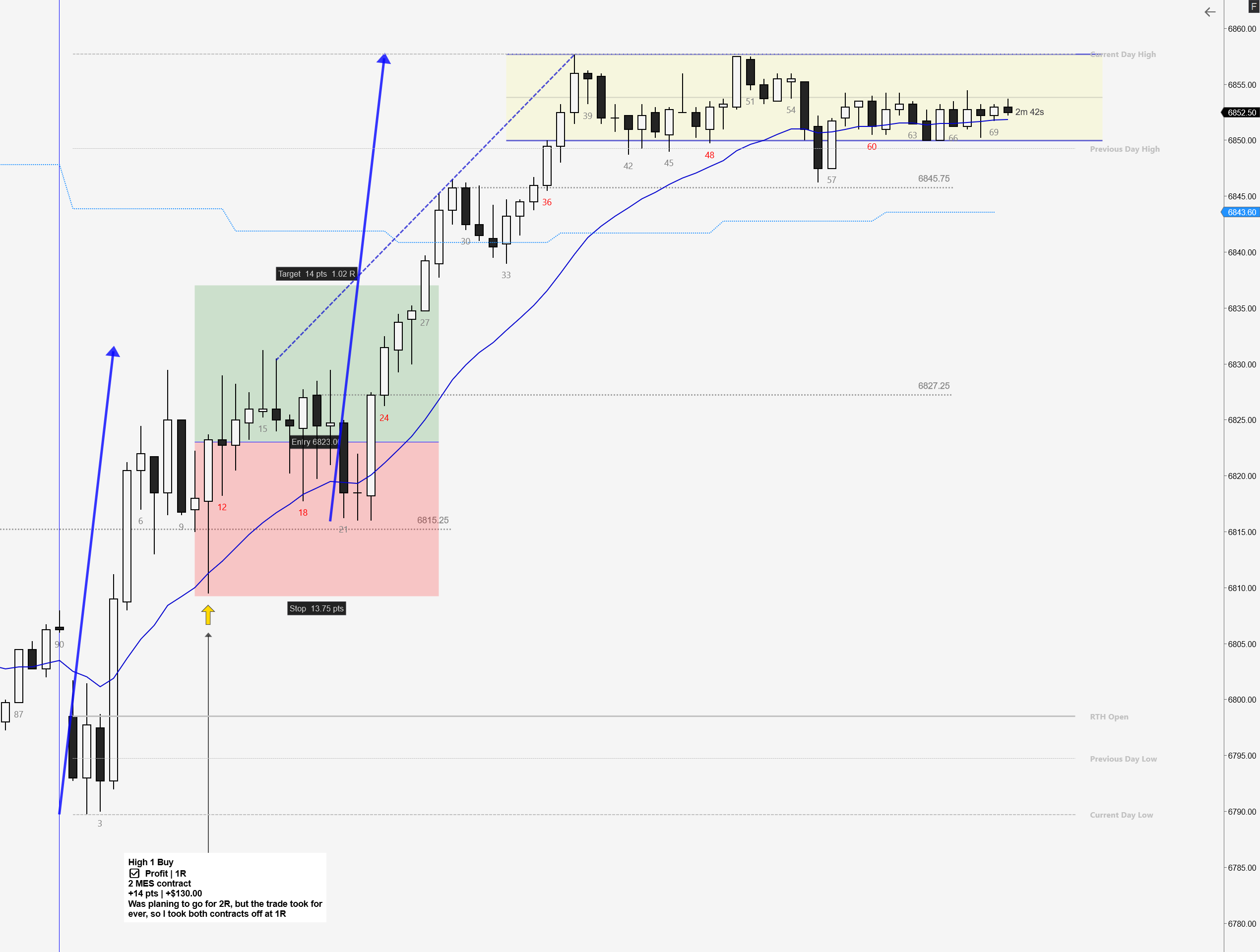 I was planning to go for 2R on the trade, but it took forever — about 1 hour and 20 minutes just to reach 1R — so I took both contracts off there. I was hoping to ride it back to yesterday’s high, which also lined up with the measured move of the first leg, but honestly, I just didn’t have the mental strength to hold it that long 😂. Plus, price would’ve had to cut through the 1-hour 20 EMA to get there.
