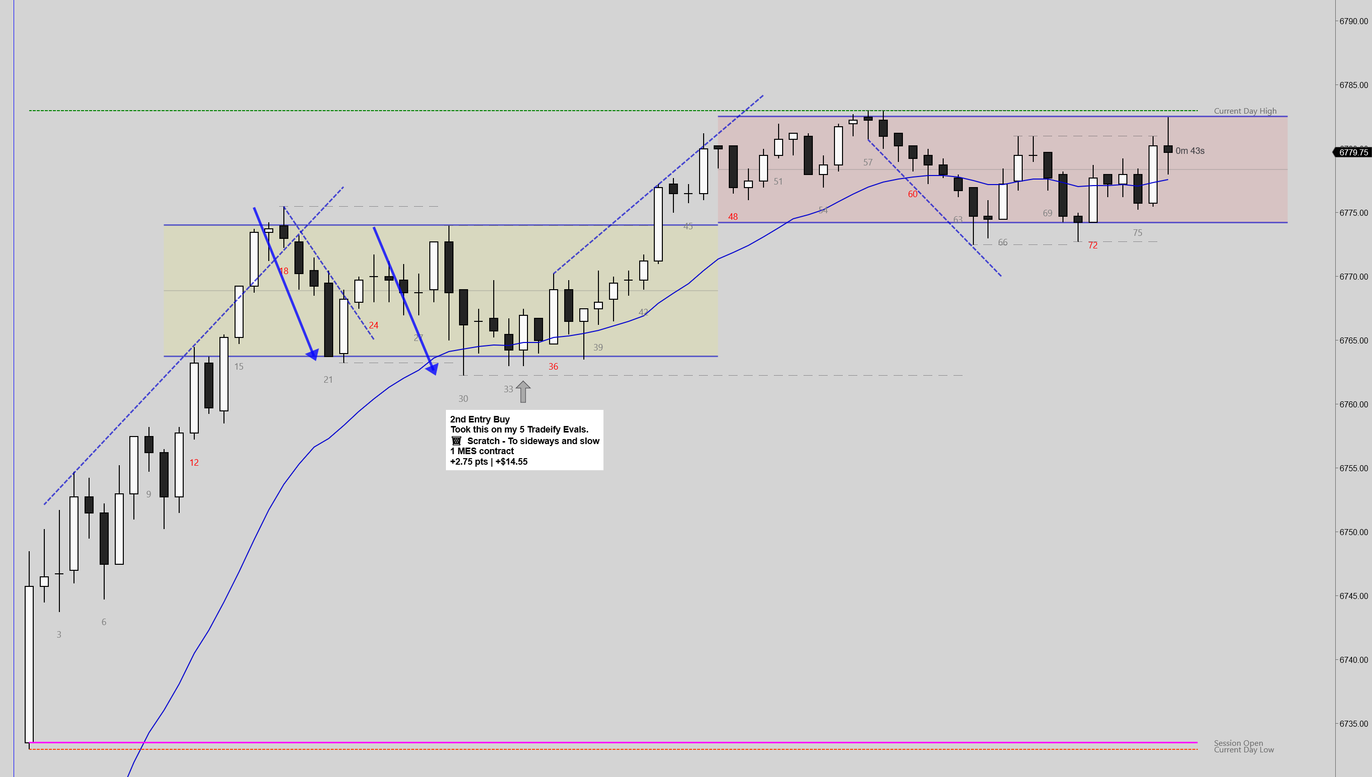 Later in the session, a two-legged pullback formed and gave a 2nd Entry Buy setup. The bullish signal bar didn’t trigger immediately, but in Brooks’ approach, that’s not as crucial as in Mack’s or Thomas Wade’s systems. I entered when it triggered one bar later. The setup made sense in context, but the market moved slowly with weak follow-through, so I scratched the trade for a small profit. I only took this trade on the five Tradeify eval accounts. The trade eventually worked after I was out.
