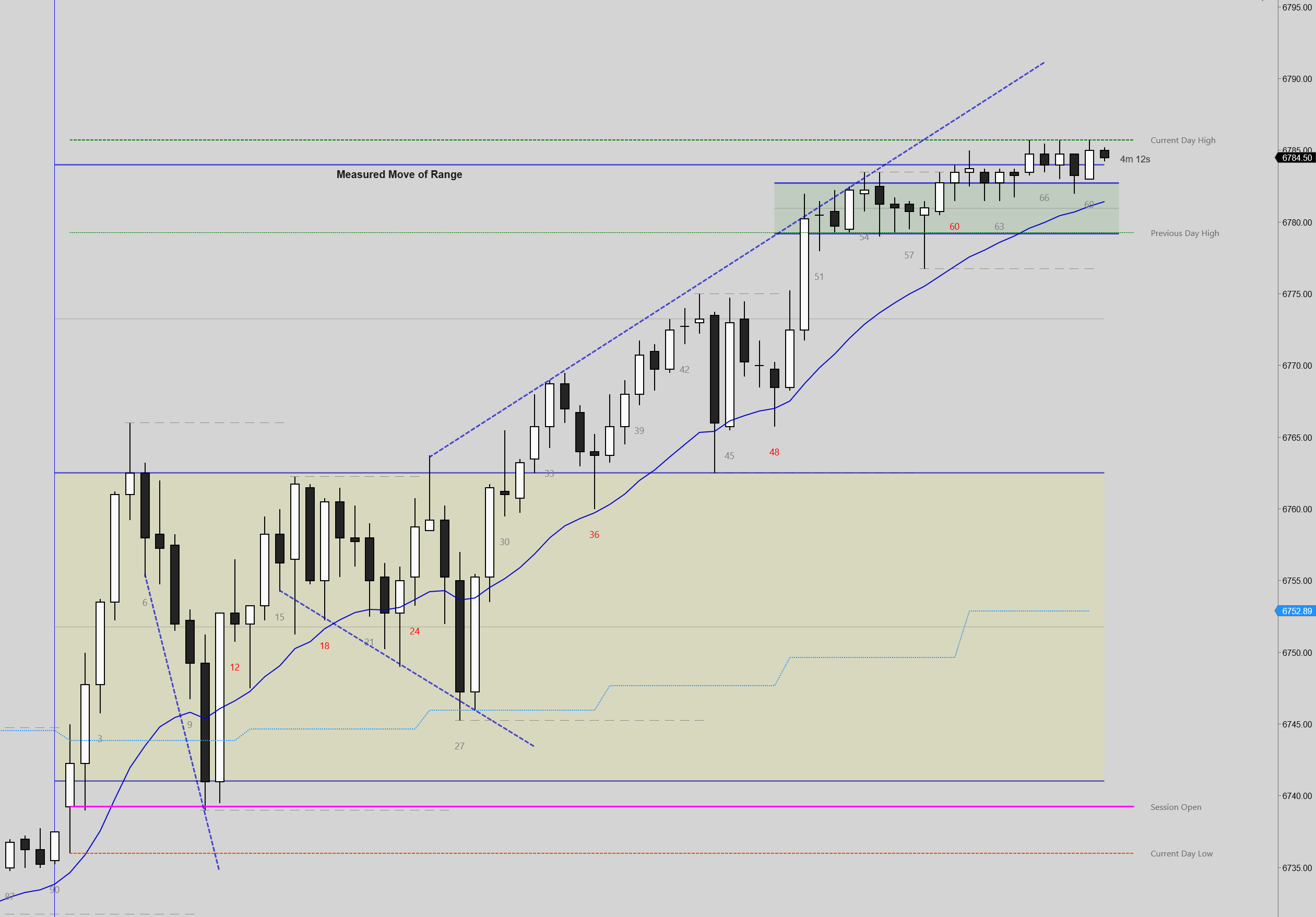 The day started out as a trading range, showing signs of bullish imbalance since prices couldn’t reach down to the session open. I expected a possible breakout to the upside — and it did. Still, the bulls looked weak, and there wasn’t a clear BOPB setup outside the range. That made me lean toward the idea that we’d go back into the range, so I held off on a few long setups that eventually would have worked — they just felt too risky in the moment.