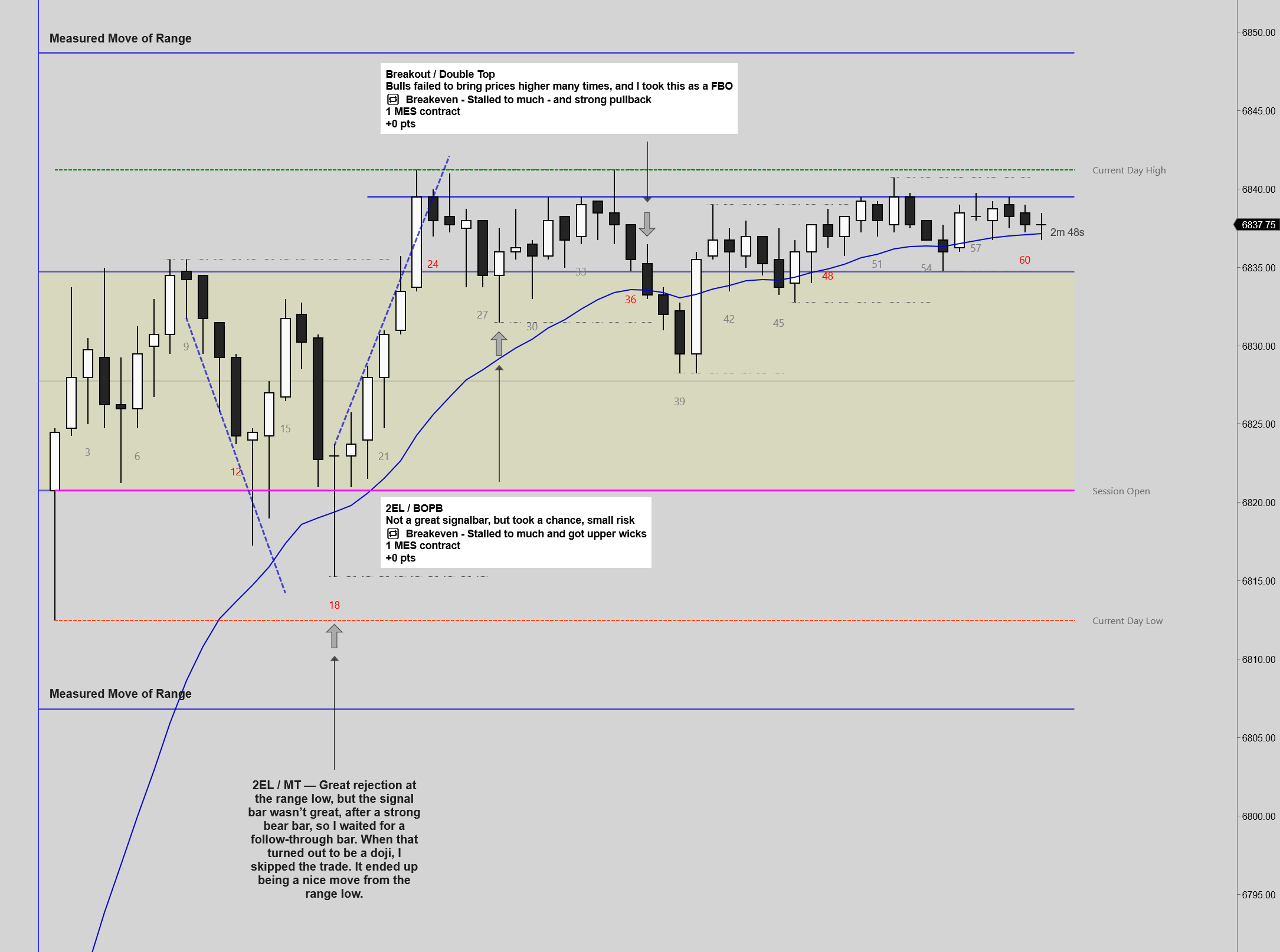 After a strong leg up and a breakout to the upside, we got a 2EL / BOPB at the top of the range. The signal bar wasn’t great, but I took a chance with one MES contract. The trade stalled with several bars showing upper wicks, so I took it off at breakeven. Prices hovered around the range top for a while. When a double top formed, I started looking for a reversal back into the range. After three consecutive bear bars breaking back inside, I entered short, expecting a test of the range low for at least 1R. Again, the market stalled after a strong bullish pullback, and I took it off at breakeven.