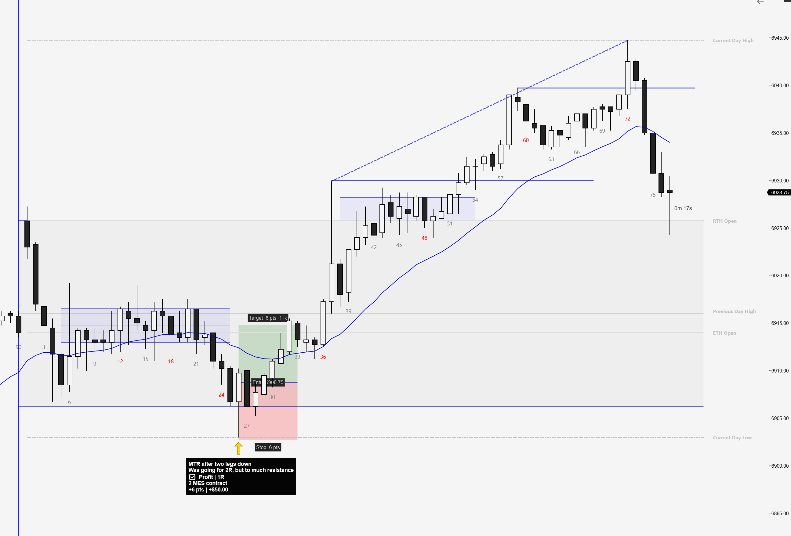 I got to the chart about an hour later than usual due to daylight saving time in Norway. By then, the market had already formed two bear legs down with a small consolidation between them. A strong bullish bar appeared, and I entered long, betting on a possible MTR after the two legs down — also a bit of a failed breakout (FBO) from that small consolidation. My plan was to aim for 2R since there was room up to the RTH open, but we had to push through resistance from the earlier consolidation. Because of that, I decided to take both contracts off at 1R. Right after I exited, the market suddenly shot up, likely on news.