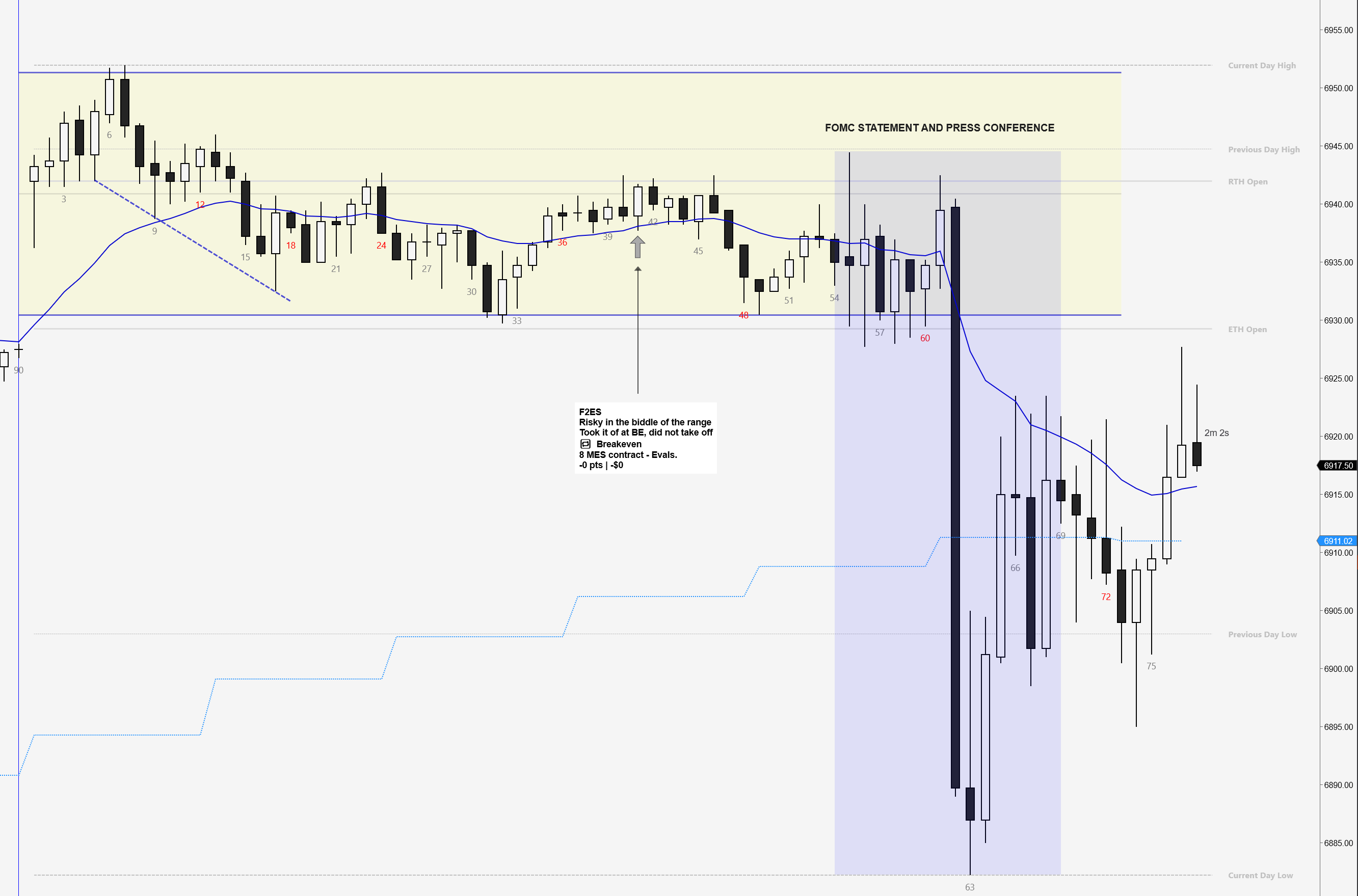 After we moved back into the range, I took a chance on a failed 2nd Entry Short (F2ES). It wasn’t a great setup, and bars were pretty stacked. But I gave it a shot. The trade stalled and never took off, so I closed it at breakeven. After that, I mostly waited for the FOMC release. The initial reaction was muted, but once Powell started speaking, the market took a sharp nose dive and became extremely volatile — completely untradeable for me. That was the end of the day.